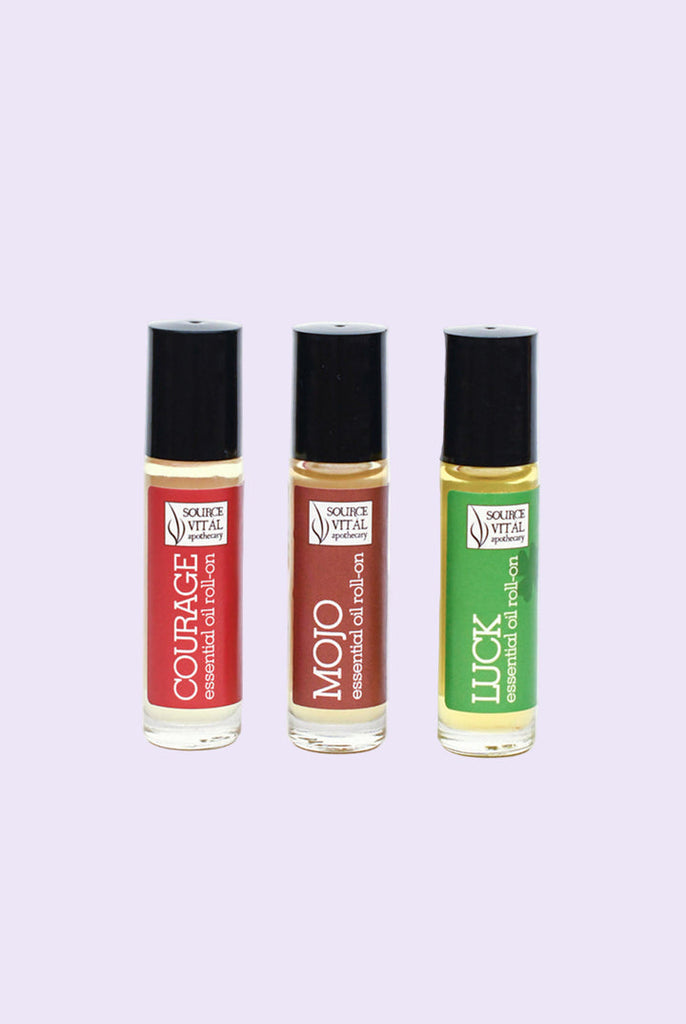 Face the day with energy and self assurance. This set of three essential oil roll-ons is designed to help you feel brave, optimistic, and full of life. Each blend combines pure essential oils with nourishing carrier oils, perfect for on the go rituals that support your mood and mindset. The trio includes Courage, Luck, and Mojo roll-ons.